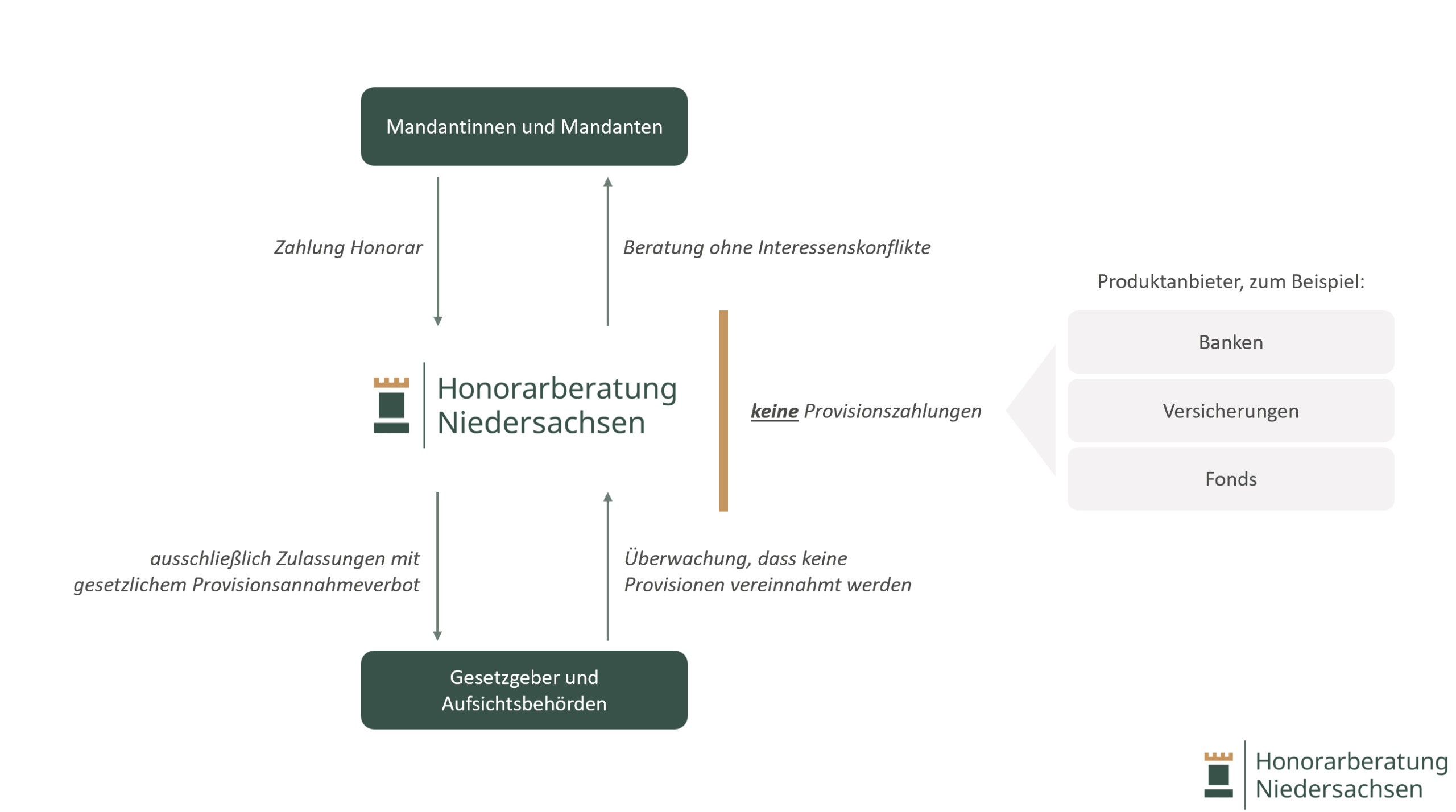 Die Leistung der Honorarberatung Niedersachsen GmbH ist immer vollständig provisionsfrei und frei von Interessenkonflikten. In seltenen Fällen kann es technisch vorkommen, dass eine Bank eine Provisionszahlung an uns nicht unterbinden kann. In einem solchen Fall sind wir gesetzlich verpflichtet, diese Provision unverzüglich und ungekürzt an Sie auszuzahlen.